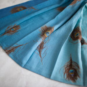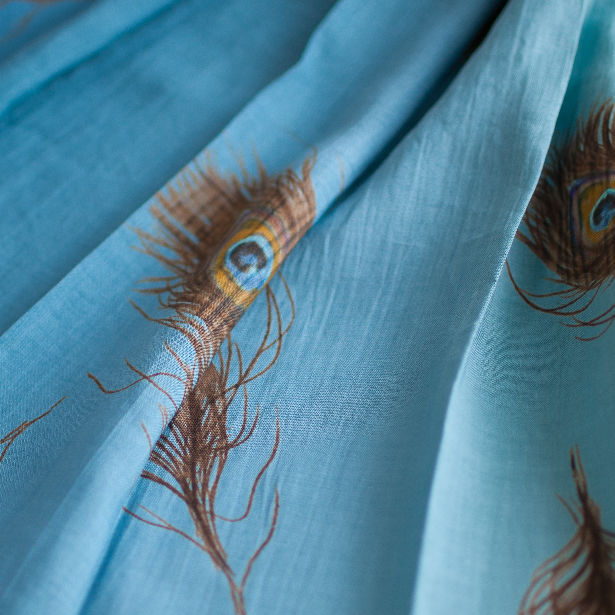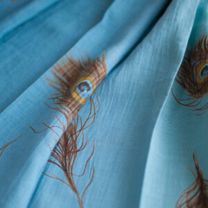 孔雀の羽根を思わせる繊細なモチーフを、友禅で贅沢に染め上げた一枚。