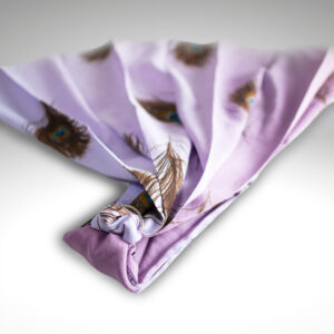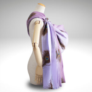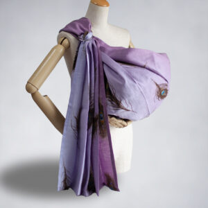 ピーコック(孔雀)の羽根を思わせるモチーフを、友禅ならではの精緻な型と手染めで表現した一枚。ブルーグリーンからニュアンスベージュへと移ろう色合いが、動きに合わせて奥行きと艶を生みます。細部まで作り込まれたオリジナルデザインは、カジュアルにもドレスアップにも自然に溶け込み、コーディネートを端正にまとめてくれます。リングはクールに仕上げるならシルバー、華やかさを添えるならゴールドがおすすめ。毎日の装いをクラスアップする、存在感ある一本です。