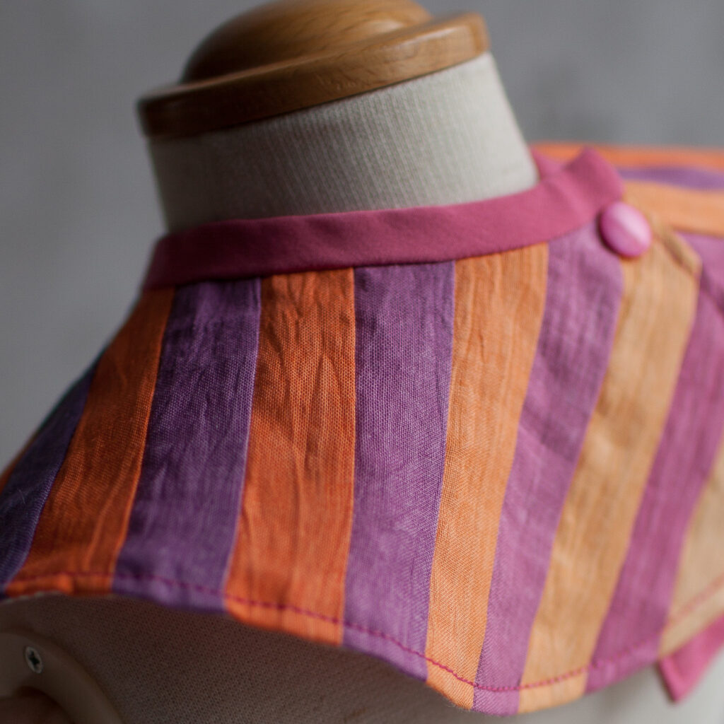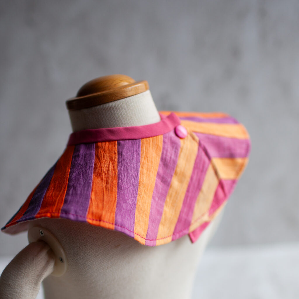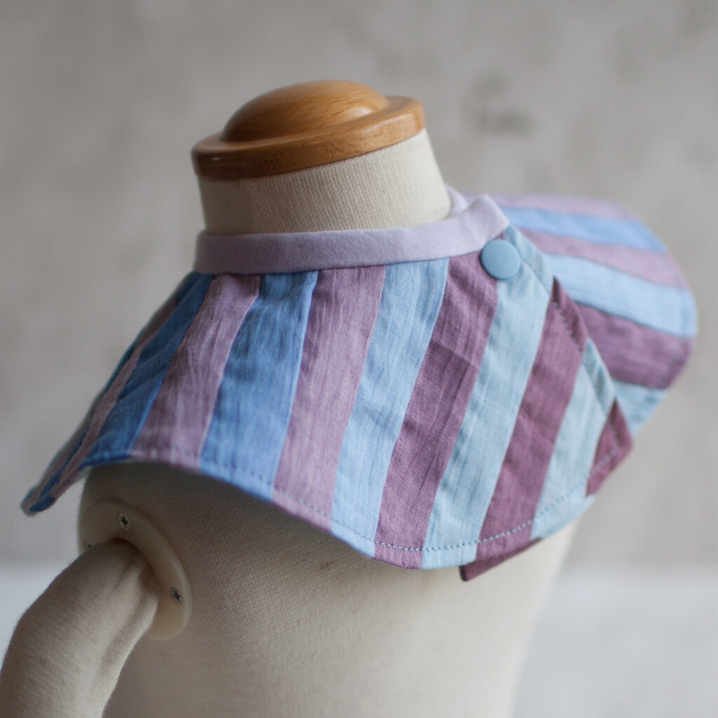 ピースリング ビブは、ハレの日用にお仕立てされた、とても手のこんだ作品です。日本の伝統技術を使った美しいグラデーションの生地がベースの素材感と丁寧な縫製による感触が、ベビーを幸せた気持ちで飾ってくれます。